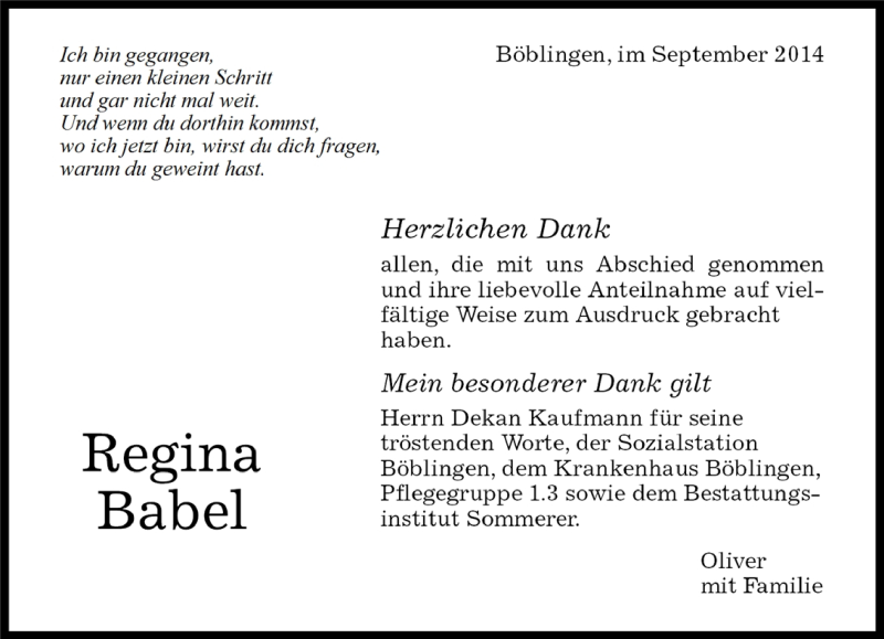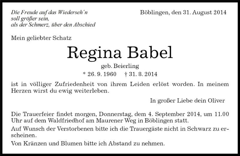 Hier finden Sie alle Traueranzeigen aus der Zeitung, die bisher für Regina Babel erschienen sind. Weitere Traueranzeigen, die in der Zeitung erscheinen, werden hier ebenfalls aufgelistet