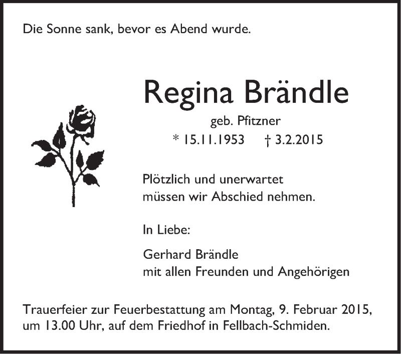 Hier finden Sie alle Traueranzeigen aus der Zeitung, die bisher für Regina Brändle erschienen sind. Weitere Traueranzeigen, die in der Zeitung erscheinen, werden hier ebenfalls aufgelistet
