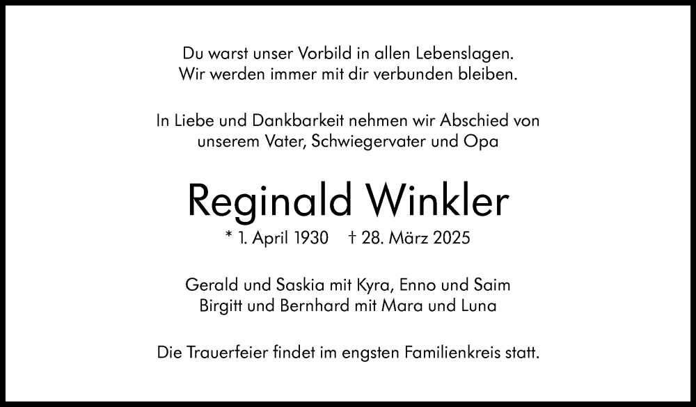 Hier finden Sie alle Traueranzeigen aus der Zeitung, die bisher für Reginald Winkler erschienen sind. Weitere Traueranzeigen, die in der Zeitung erscheinen, werden hier ebenfalls aufgelistet