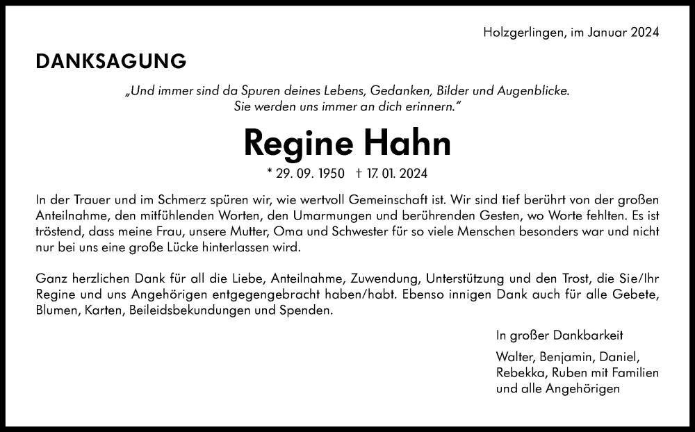 Hier finden Sie alle Traueranzeigen aus der Zeitung, die bisher für Regine Hahn erschienen sind. Weitere Traueranzeigen, die in der Zeitung erscheinen, werden hier ebenfalls aufgelistet