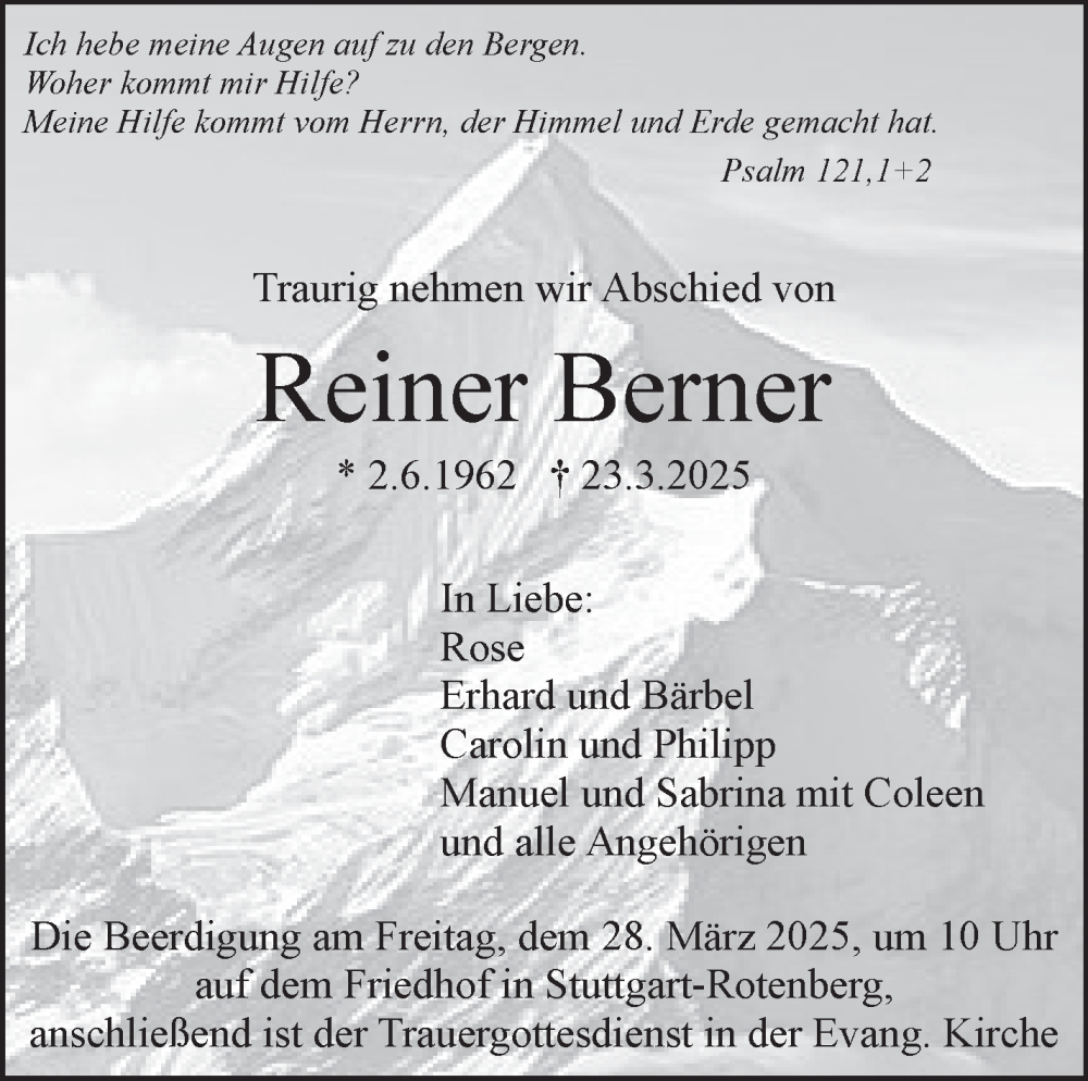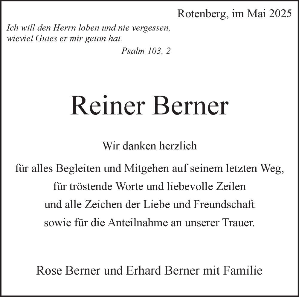Hier finden Sie alle Traueranzeigen aus der Zeitung, die bisher für Reiner Berner erschienen sind. Weitere Traueranzeigen, die in der Zeitung erscheinen, werden hier ebenfalls aufgelistet