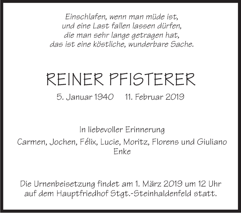 Hier finden Sie alle Traueranzeigen aus der Zeitung, die bisher für Reiner Pfisterer erschienen sind. Weitere Traueranzeigen, die in der Zeitung erscheinen, werden hier ebenfalls aufgelistet
