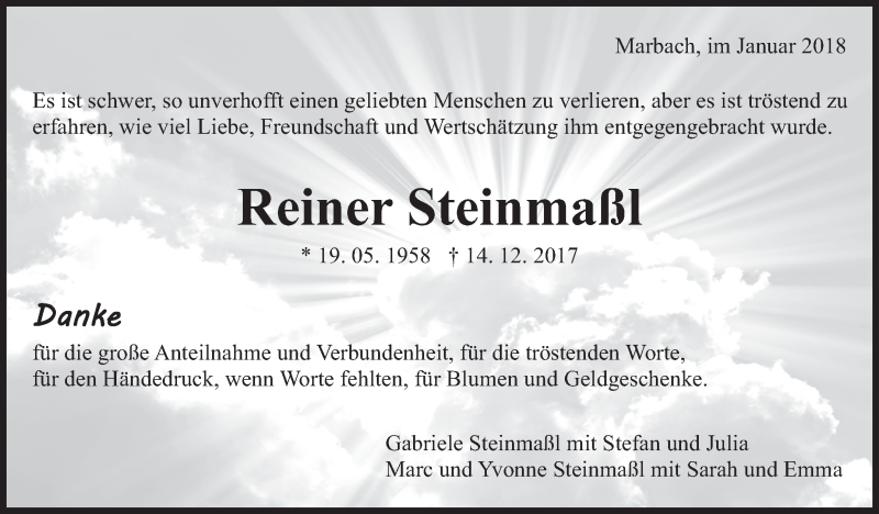 Hier finden Sie alle Traueranzeigen aus der Zeitung, die bisher für Reiner Steinmaßl erschienen sind. Weitere Traueranzeigen, die in der Zeitung erscheinen, werden hier ebenfalls aufgelistet