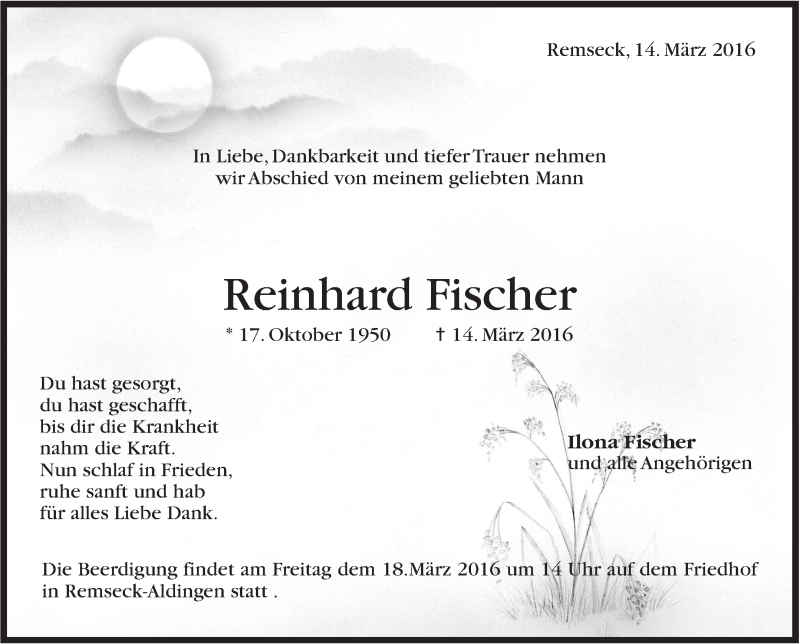 Hier finden Sie alle Traueranzeigen aus der Zeitung, die bisher für Reinhard Fischer erschienen sind. Weitere Traueranzeigen, die in der Zeitung erscheinen, werden hier ebenfalls aufgelistet