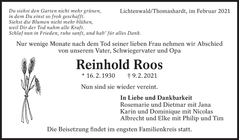 Hier finden Sie alle Traueranzeigen aus der Zeitung, die bisher für Reinhold Roos erschienen sind. Weitere Traueranzeigen, die in der Zeitung erscheinen, werden hier ebenfalls aufgelistet