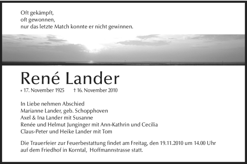 Hier finden Sie alle Traueranzeigen aus der Zeitung, die bisher für René Lander erschienen sind. Weitere Traueranzeigen, die in der Zeitung erscheinen, werden hier ebenfalls aufgelistet