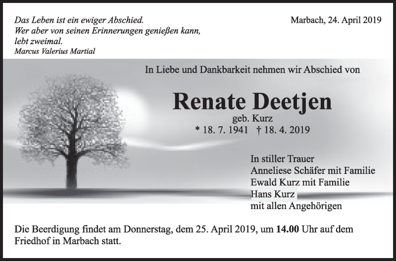 Hier finden Sie alle Traueranzeigen aus der Zeitung, die bisher für Renate Deetjen erschienen sind. Weitere Traueranzeigen, die in der Zeitung erscheinen, werden hier ebenfalls aufgelistet