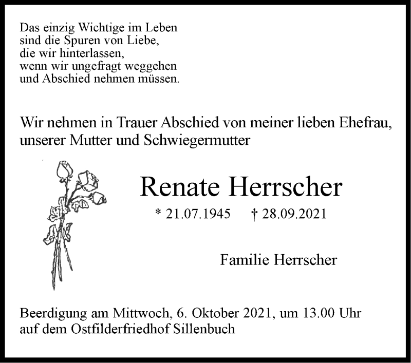 Hier finden Sie alle Traueranzeigen aus der Zeitung, die bisher für Renate Herrscher erschienen sind. Weitere Traueranzeigen, die in der Zeitung erscheinen, werden hier ebenfalls aufgelistet