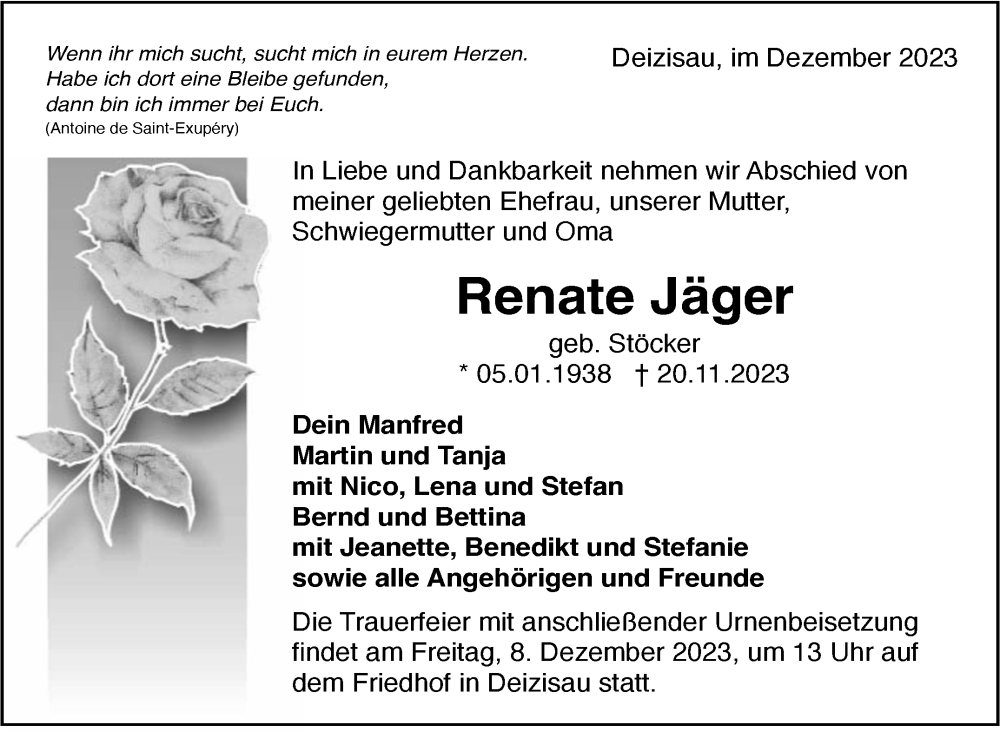 Hier finden Sie alle Traueranzeigen aus der Zeitung, die bisher für Renate Jäger erschienen sind. Weitere Traueranzeigen, die in der Zeitung erscheinen, werden hier ebenfalls aufgelistet