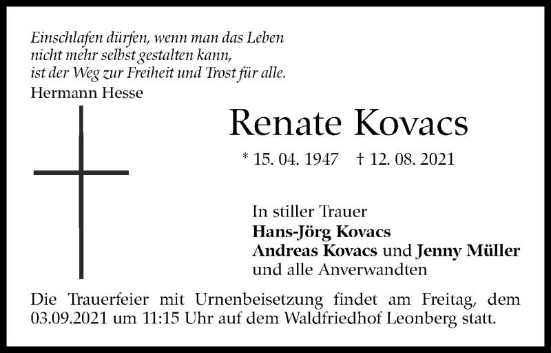 Hier finden Sie alle Traueranzeigen aus der Zeitung, die bisher für Renate Kovacs erschienen sind. Weitere Traueranzeigen, die in der Zeitung erscheinen, werden hier ebenfalls aufgelistet