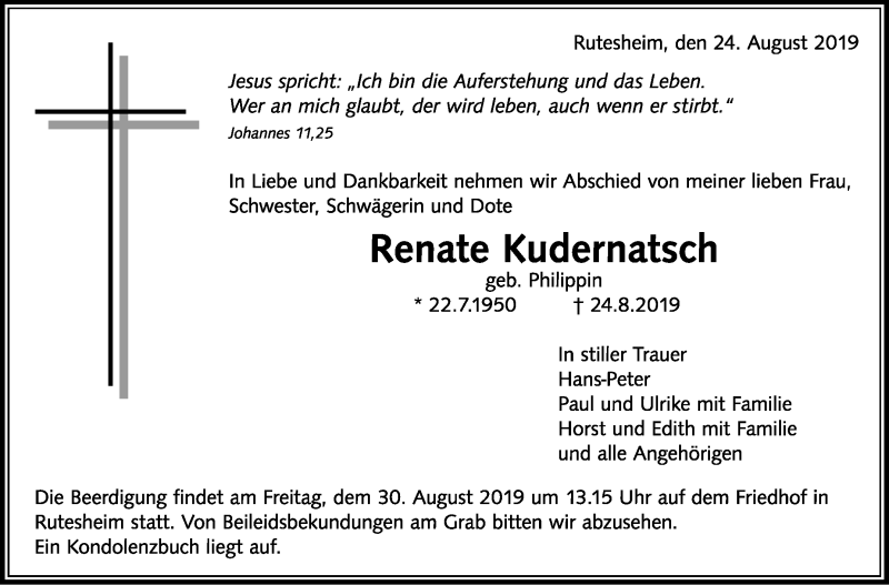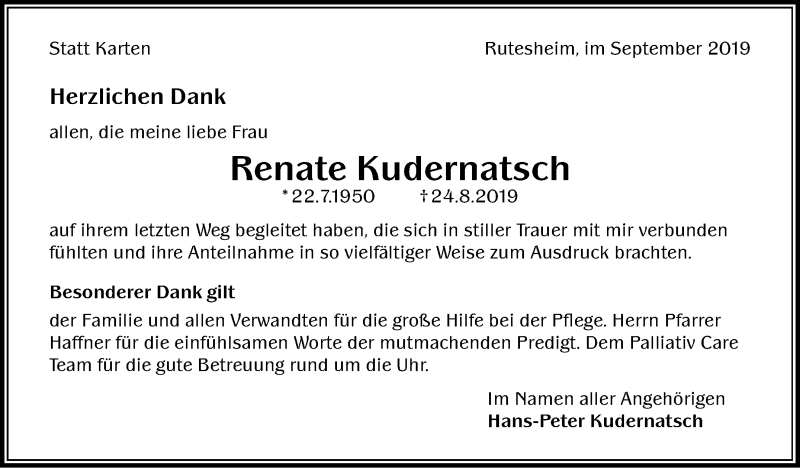 Hier finden Sie alle Traueranzeigen aus der Zeitung, die bisher für Renate Kudernatsch erschienen sind. Weitere Traueranzeigen, die in der Zeitung erscheinen, werden hier ebenfalls aufgelistet