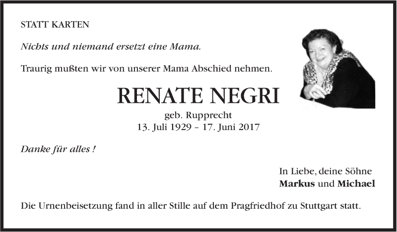 Hier finden Sie alle Traueranzeigen aus der Zeitung, die bisher für Renate Negri erschienen sind. Weitere Traueranzeigen, die in der Zeitung erscheinen, werden hier ebenfalls aufgelistet