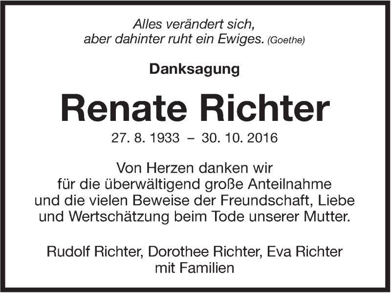 Hier finden Sie alle Traueranzeigen aus der Zeitung, die bisher für Renate Richter erschienen sind. Weitere Traueranzeigen, die in der Zeitung erscheinen, werden hier ebenfalls aufgelistet