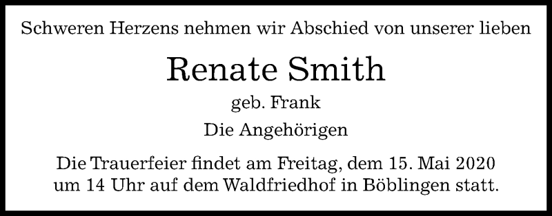 Hier finden Sie alle Traueranzeigen aus der Zeitung, die bisher für Renate Smith erschienen sind. Weitere Traueranzeigen, die in der Zeitung erscheinen, werden hier ebenfalls aufgelistet