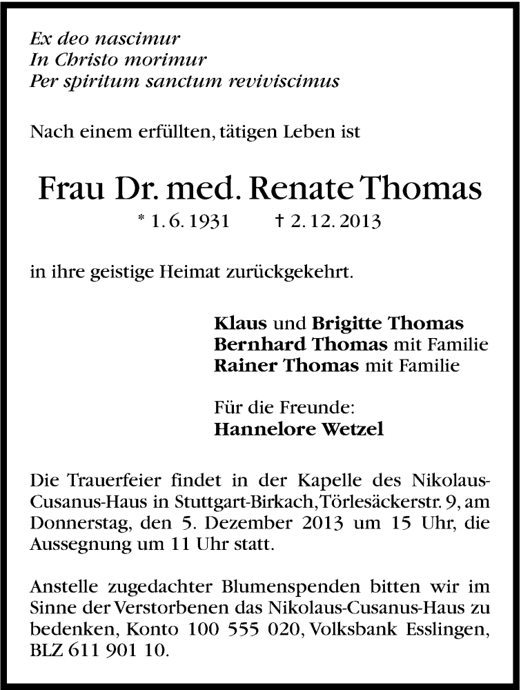 Hier finden Sie alle Traueranzeigen aus der Zeitung, die bisher für Renate Thomas erschienen sind. Weitere Traueranzeigen, die in der Zeitung erscheinen, werden hier ebenfalls aufgelistet
