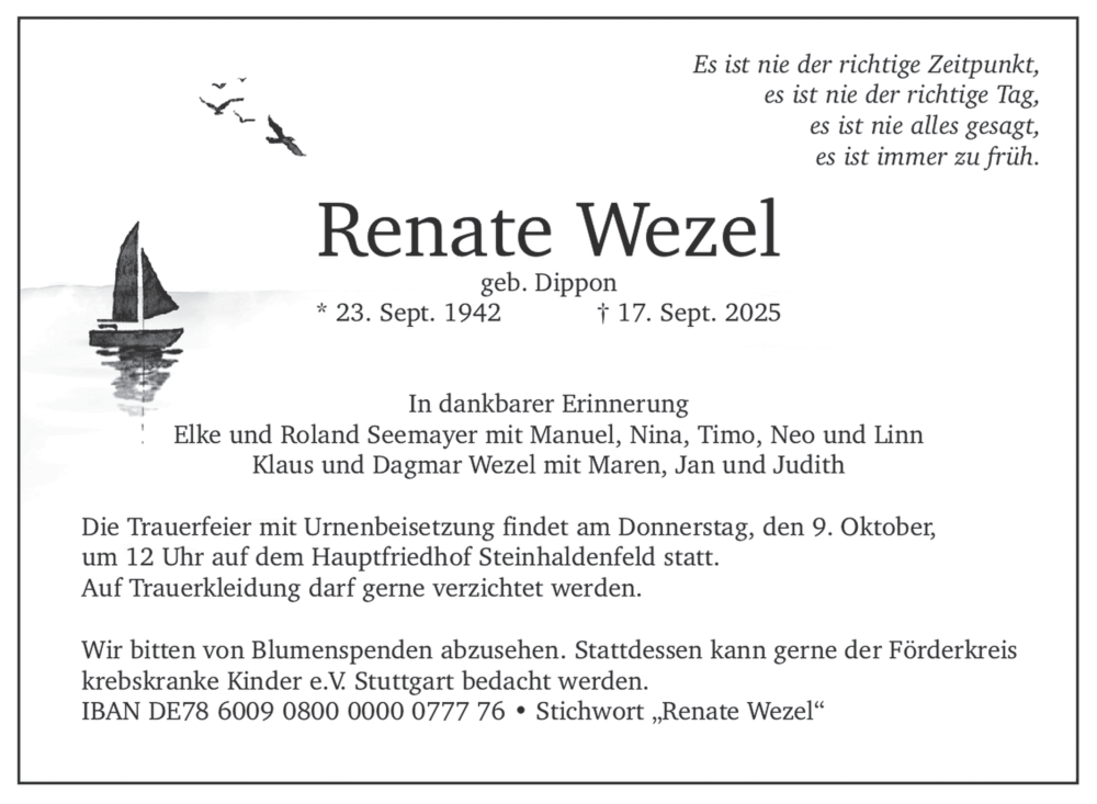Hier finden Sie alle Traueranzeigen aus der Zeitung, die bisher für Renate Wezel erschienen sind. Weitere Traueranzeigen, die in der Zeitung erscheinen, werden hier ebenfalls aufgelistet