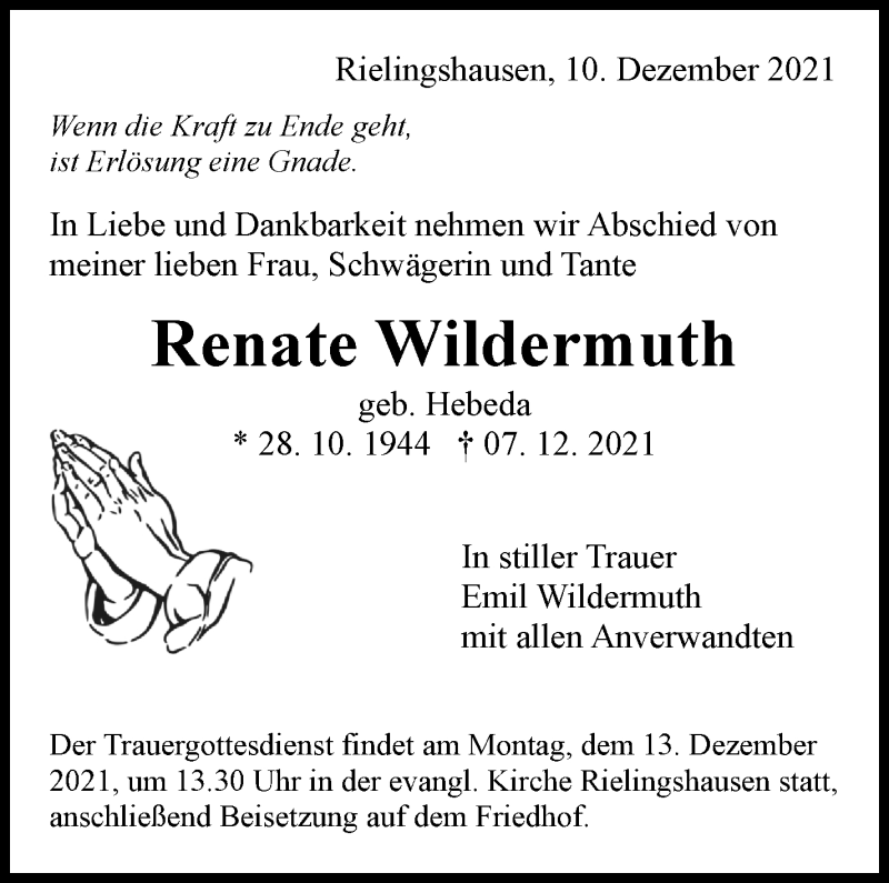Hier finden Sie alle Traueranzeigen aus der Zeitung, die bisher für Renate Wildermuth erschienen sind. Weitere Traueranzeigen, die in der Zeitung erscheinen, werden hier ebenfalls aufgelistet