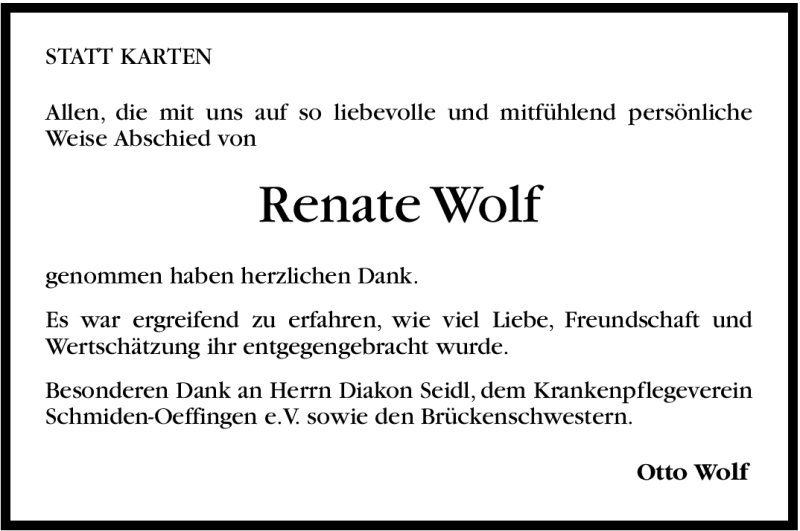 Hier finden Sie alle Traueranzeigen aus der Zeitung, die bisher für Renate Wolf erschienen sind. Weitere Traueranzeigen, die in der Zeitung erscheinen, werden hier ebenfalls aufgelistet