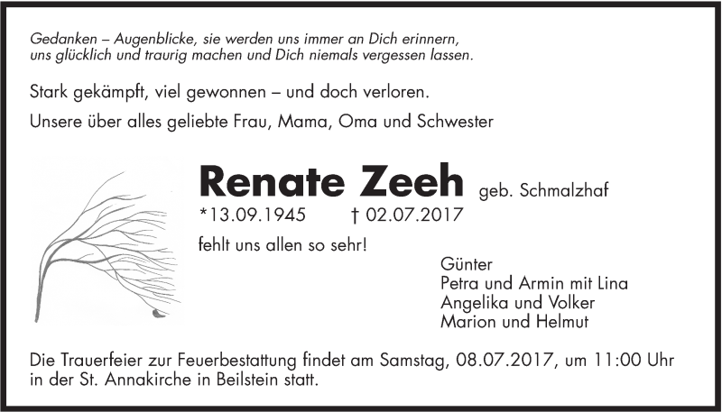 Hier finden Sie alle Traueranzeigen aus der Zeitung, die bisher für Renate Zeeh erschienen sind. Weitere Traueranzeigen, die in der Zeitung erscheinen, werden hier ebenfalls aufgelistet