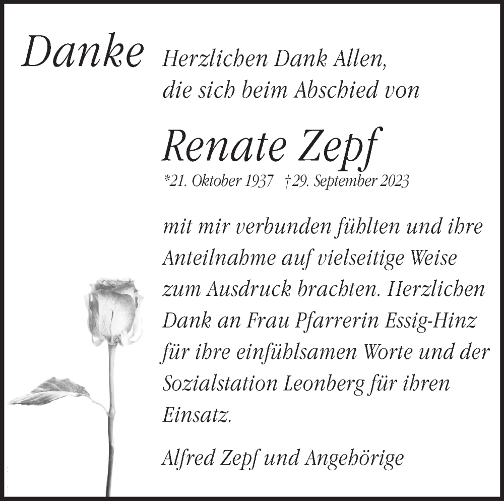 Hier finden Sie alle Traueranzeigen aus der Zeitung, die bisher für Renate Zepf erschienen sind. Weitere Traueranzeigen, die in der Zeitung erscheinen, werden hier ebenfalls aufgelistet