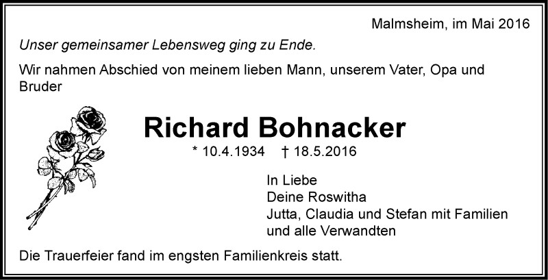 Hier finden Sie alle Traueranzeigen aus der Zeitung, die bisher für Richard Bohnacker erschienen sind. Weitere Traueranzeigen, die in der Zeitung erscheinen, werden hier ebenfalls aufgelistet