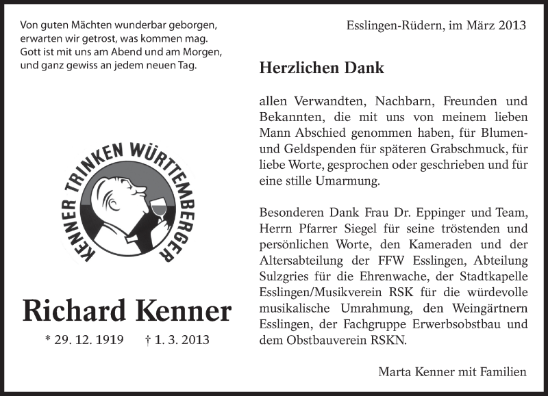 Hier finden Sie alle Traueranzeigen aus der Zeitung, die bisher für Richard Kenner erschienen sind. Weitere Traueranzeigen, die in der Zeitung erscheinen, werden hier ebenfalls aufgelistet