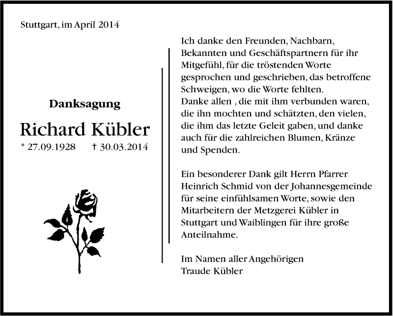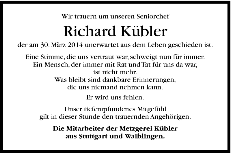 Hier finden Sie alle Traueranzeigen aus der Zeitung, die bisher für Richard Kübler erschienen sind. Weitere Traueranzeigen, die in der Zeitung erscheinen, werden hier ebenfalls aufgelistet