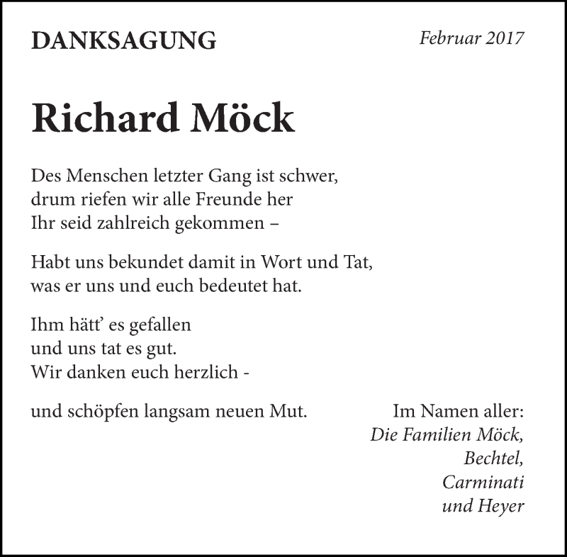 Hier finden Sie alle Traueranzeigen aus der Zeitung, die bisher für Richard Möck erschienen sind. Weitere Traueranzeigen, die in der Zeitung erscheinen, werden hier ebenfalls aufgelistet