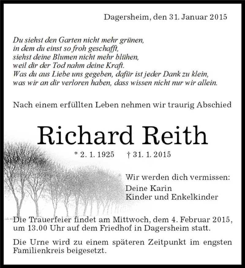 Hier finden Sie alle Traueranzeigen aus der Zeitung, die bisher für Richard Reith erschienen sind. Weitere Traueranzeigen, die in der Zeitung erscheinen, werden hier ebenfalls aufgelistet
