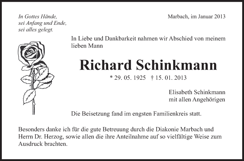 Hier finden Sie alle Traueranzeigen aus der Zeitung, die bisher für Richard Schinkmann erschienen sind. Weitere Traueranzeigen, die in der Zeitung erscheinen, werden hier ebenfalls aufgelistet