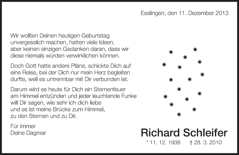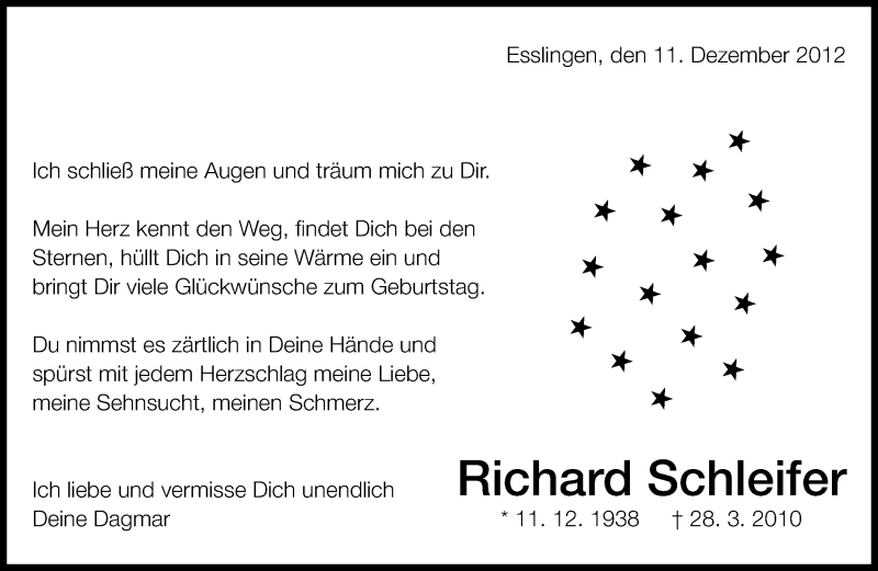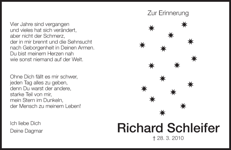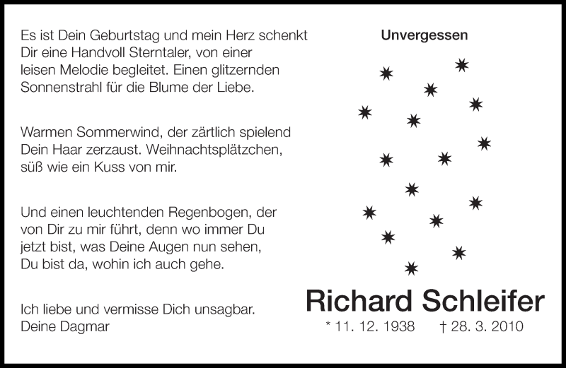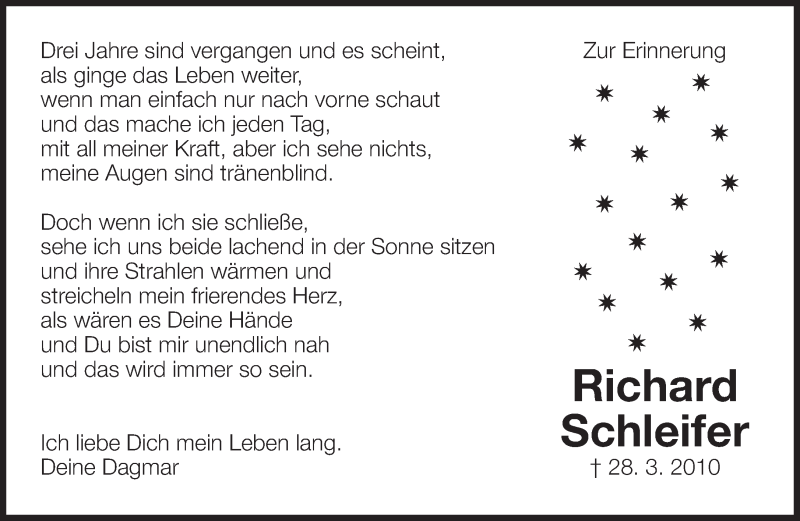 Hier finden Sie alle Traueranzeigen aus der Zeitung, die bisher für Richard Schleifer erschienen sind. Weitere Traueranzeigen, die in der Zeitung erscheinen, werden hier ebenfalls aufgelistet
