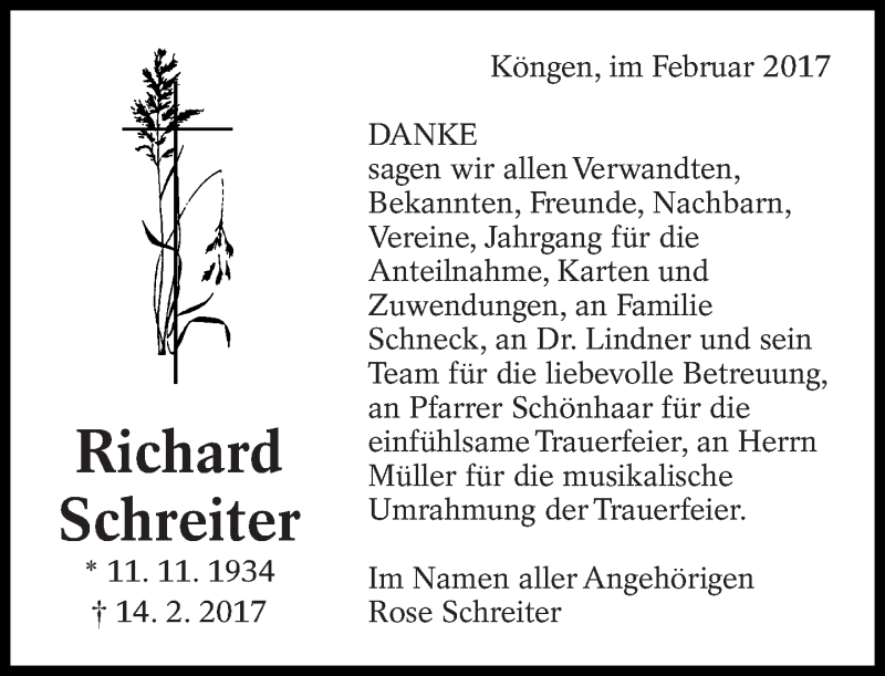Hier finden Sie alle Traueranzeigen aus der Zeitung, die bisher für Richard Schreiter erschienen sind. Weitere Traueranzeigen, die in der Zeitung erscheinen, werden hier ebenfalls aufgelistet