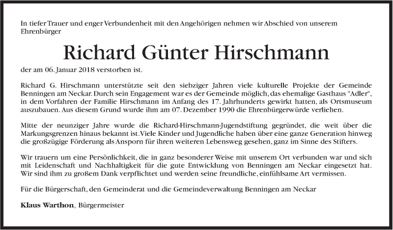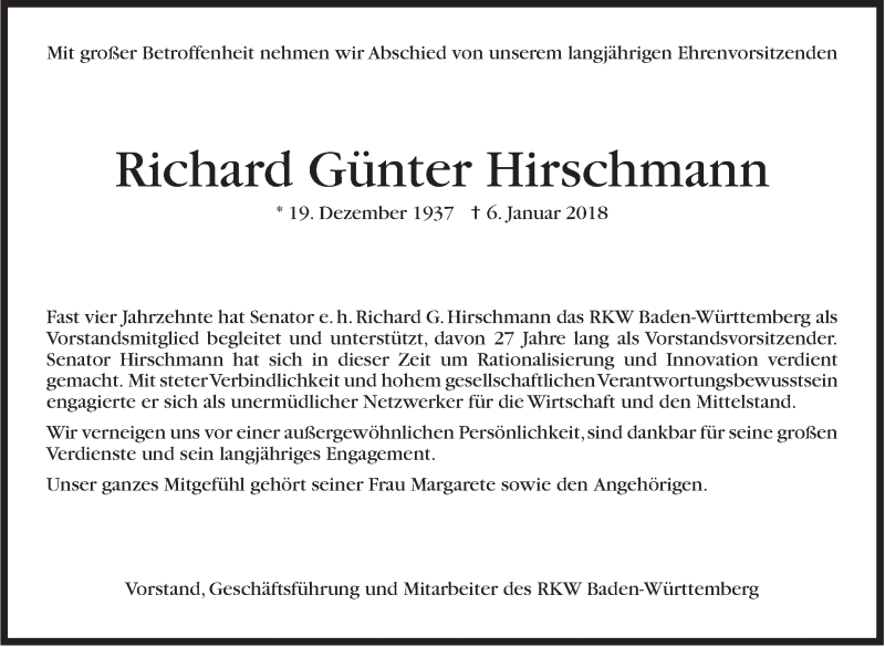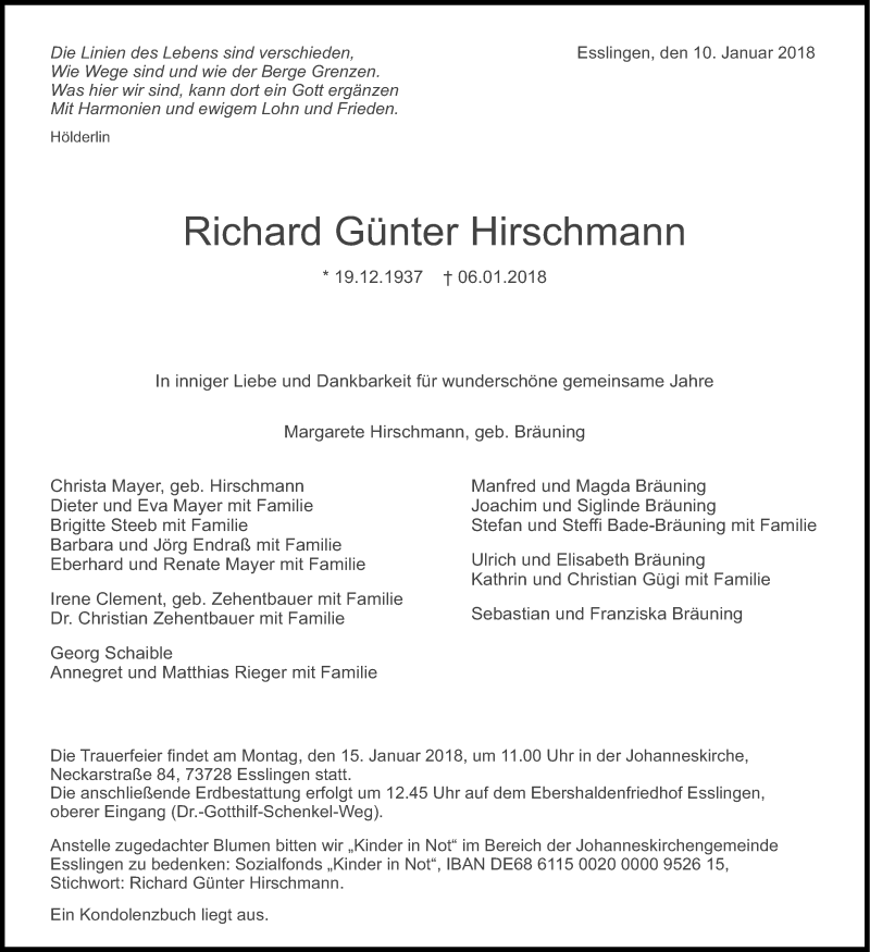 Hier finden Sie alle Traueranzeigen aus der Zeitung, die bisher für Richard Günter Hirschmann erschienen sind. Weitere Traueranzeigen, die in der Zeitung erscheinen, werden hier ebenfalls aufgelistet