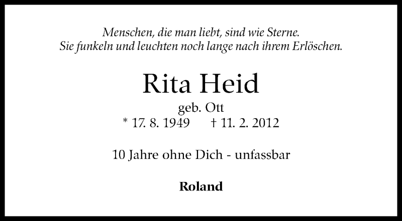 Hier finden Sie alle Traueranzeigen aus der Zeitung, die bisher für Rita Heid erschienen sind. Weitere Traueranzeigen, die in der Zeitung erscheinen, werden hier ebenfalls aufgelistet