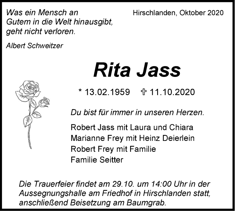Hier finden Sie alle Traueranzeigen aus der Zeitung, die bisher für Rita Jass erschienen sind. Weitere Traueranzeigen, die in der Zeitung erscheinen, werden hier ebenfalls aufgelistet