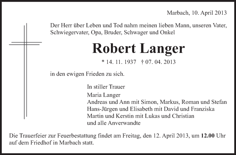 Hier finden Sie alle Traueranzeigen aus der Zeitung, die bisher für Robert Langer erschienen sind. Weitere Traueranzeigen, die in der Zeitung erscheinen, werden hier ebenfalls aufgelistet