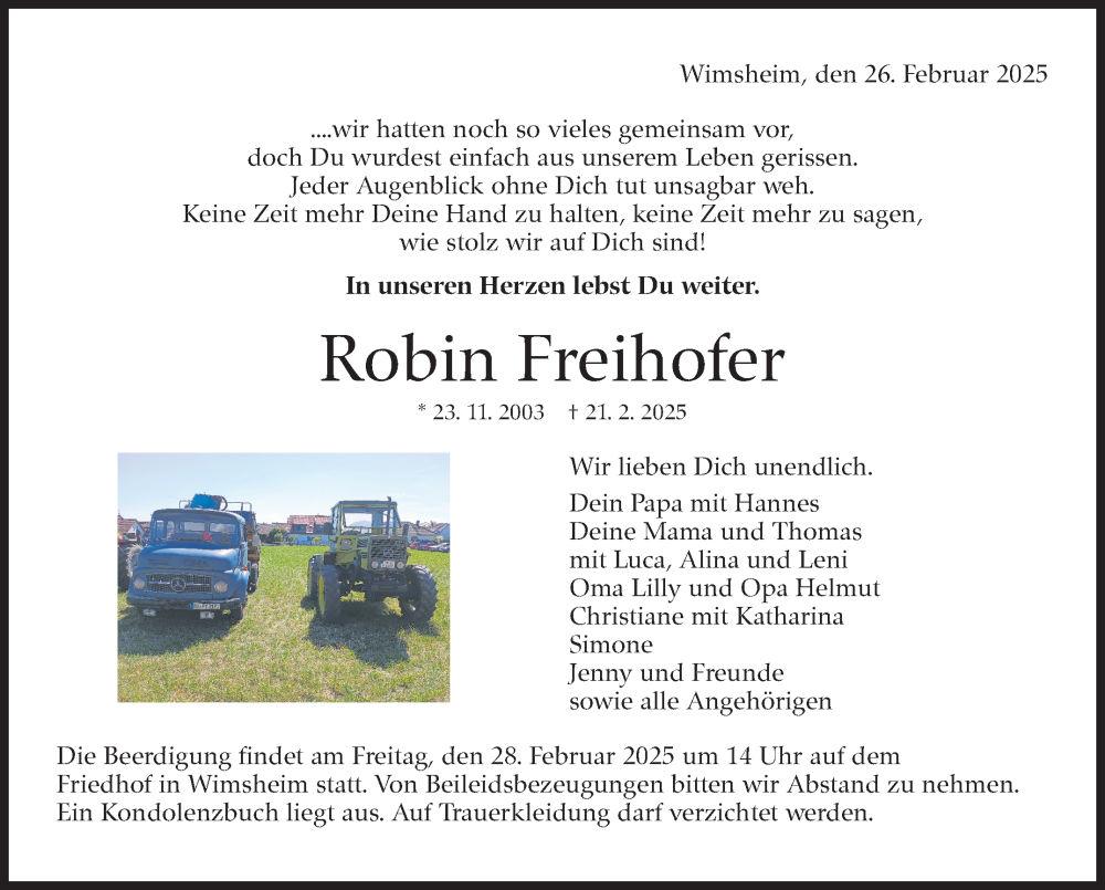 Hier finden Sie alle Traueranzeigen aus der Zeitung, die bisher für Robin Freihofer erschienen sind. Weitere Traueranzeigen, die in der Zeitung erscheinen, werden hier ebenfalls aufgelistet