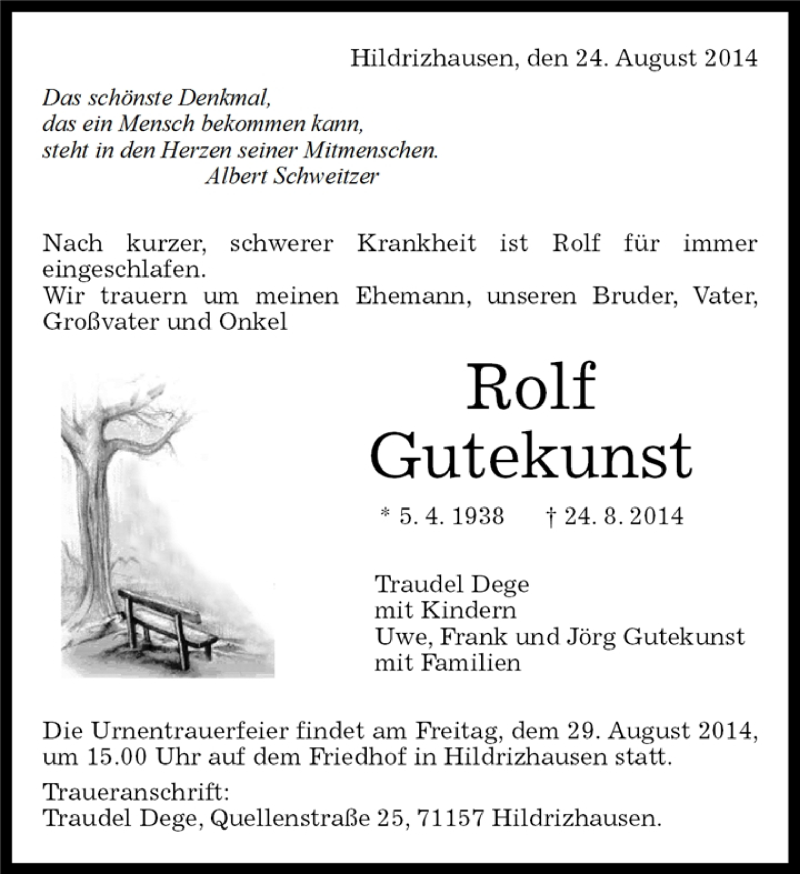 Hier finden Sie alle Traueranzeigen aus der Zeitung, die bisher für Rofl Gutekunst erschienen sind. Weitere Traueranzeigen, die in der Zeitung erscheinen, werden hier ebenfalls aufgelistet