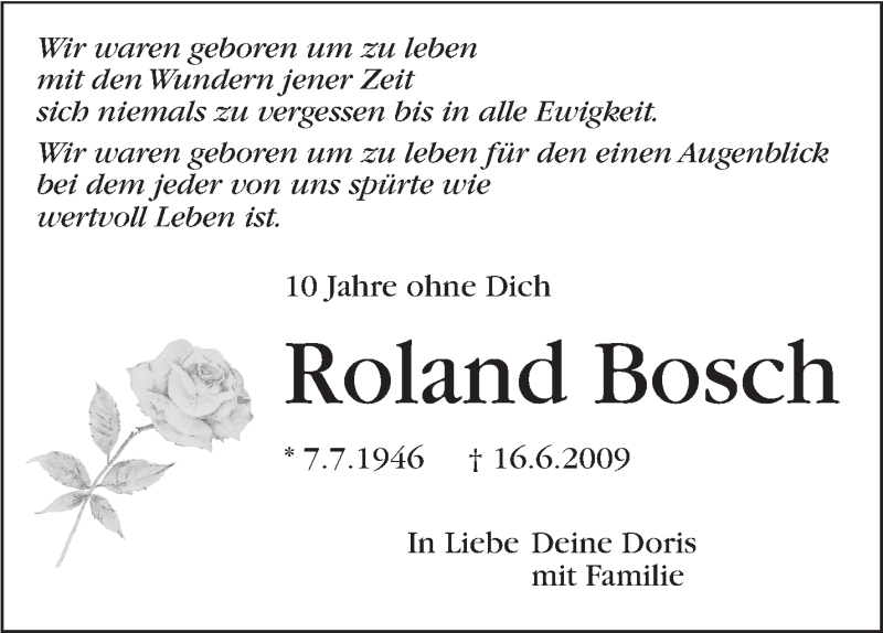 Hier finden Sie alle Traueranzeigen aus der Zeitung, die bisher für Roland Bosch erschienen sind. Weitere Traueranzeigen, die in der Zeitung erscheinen, werden hier ebenfalls aufgelistet