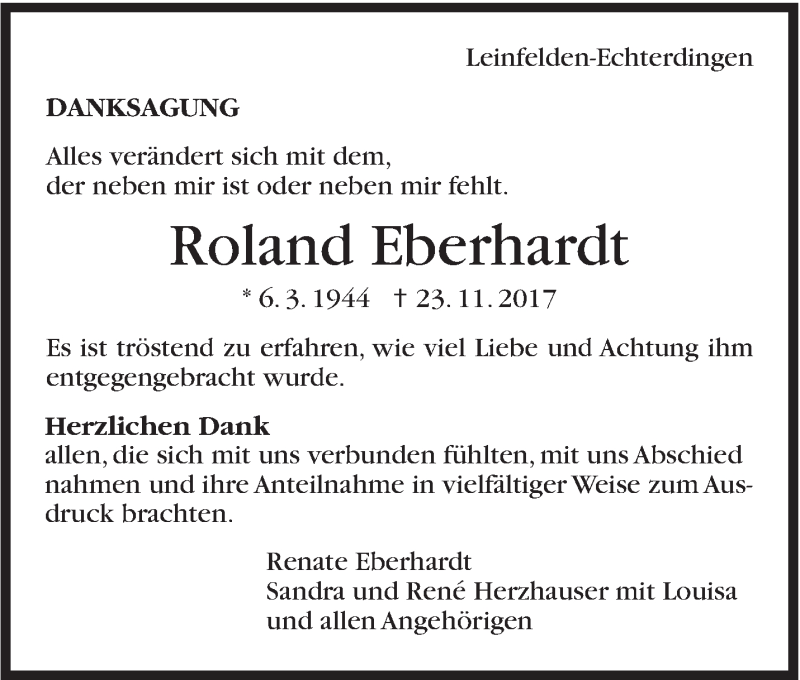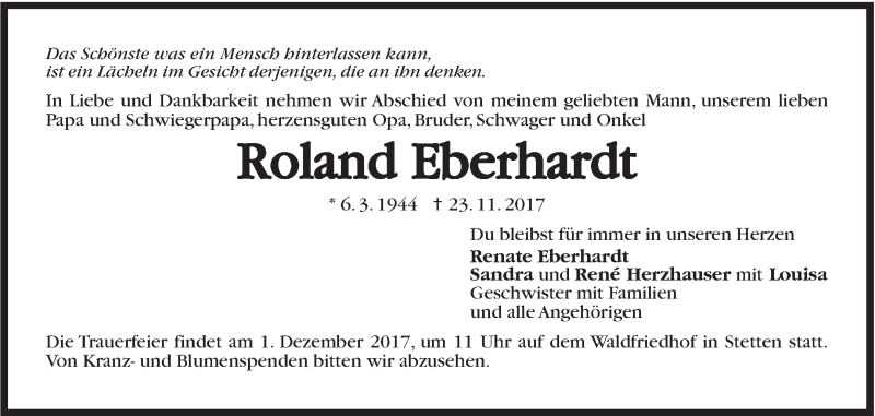 Hier finden Sie alle Traueranzeigen aus der Zeitung, die bisher für Roland Eberhardt erschienen sind. Weitere Traueranzeigen, die in der Zeitung erscheinen, werden hier ebenfalls aufgelistet