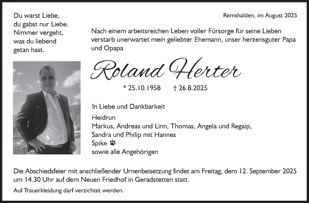 Hier finden Sie alle Traueranzeigen aus der Zeitung, die bisher für Roland Herter erschienen sind. Weitere Traueranzeigen, die in der Zeitung erscheinen, werden hier ebenfalls aufgelistet
