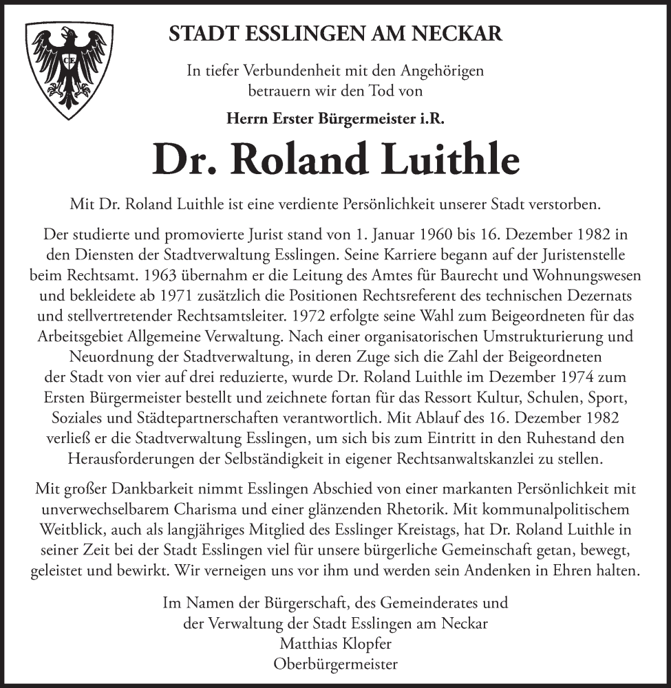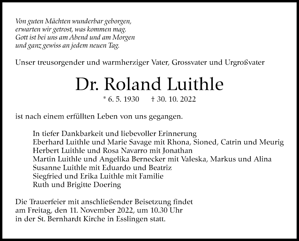 Hier finden Sie alle Traueranzeigen aus der Zeitung, die bisher für Roland Luithle erschienen sind. Weitere Traueranzeigen, die in der Zeitung erscheinen, werden hier ebenfalls aufgelistet