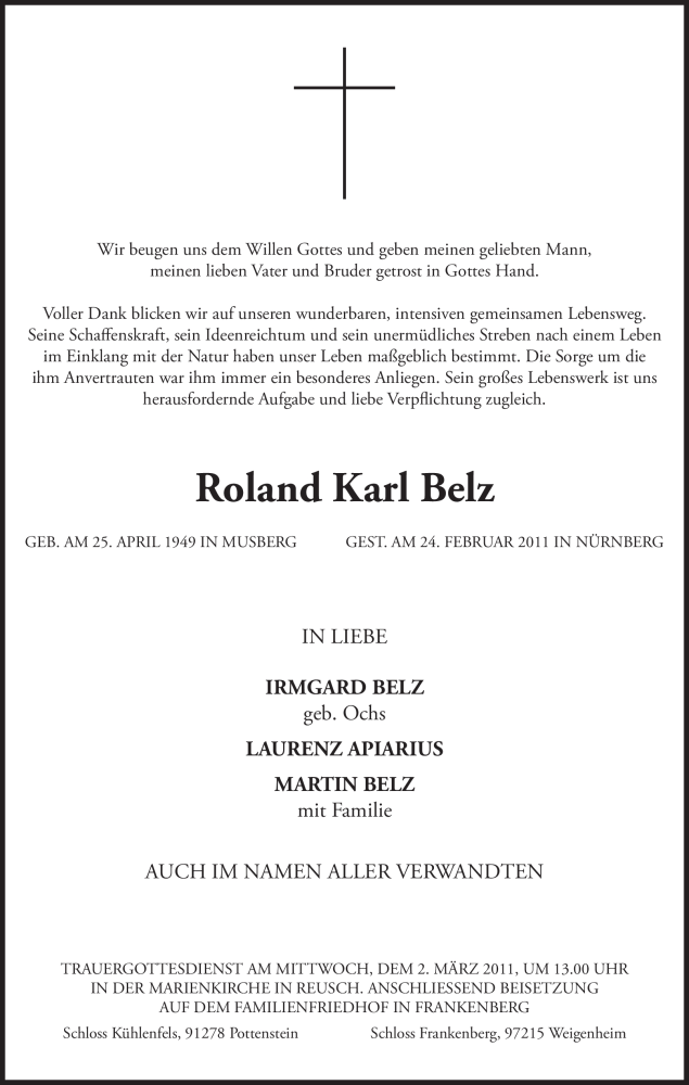Hier finden Sie alle Traueranzeigen aus der Zeitung, die bisher für Roland Karl Belz erschienen sind. Weitere Traueranzeigen, die in der Zeitung erscheinen, werden hier ebenfalls aufgelistet