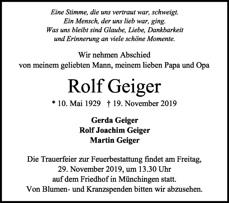 Hier finden Sie alle Traueranzeigen aus der Zeitung, die bisher für Rolf Geiger erschienen sind. Weitere Traueranzeigen, die in der Zeitung erscheinen, werden hier ebenfalls aufgelistet