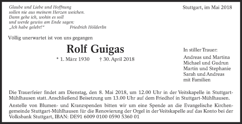 Hier finden Sie alle Traueranzeigen aus der Zeitung, die bisher für Rolf Guigas erschienen sind. Weitere Traueranzeigen, die in der Zeitung erscheinen, werden hier ebenfalls aufgelistet