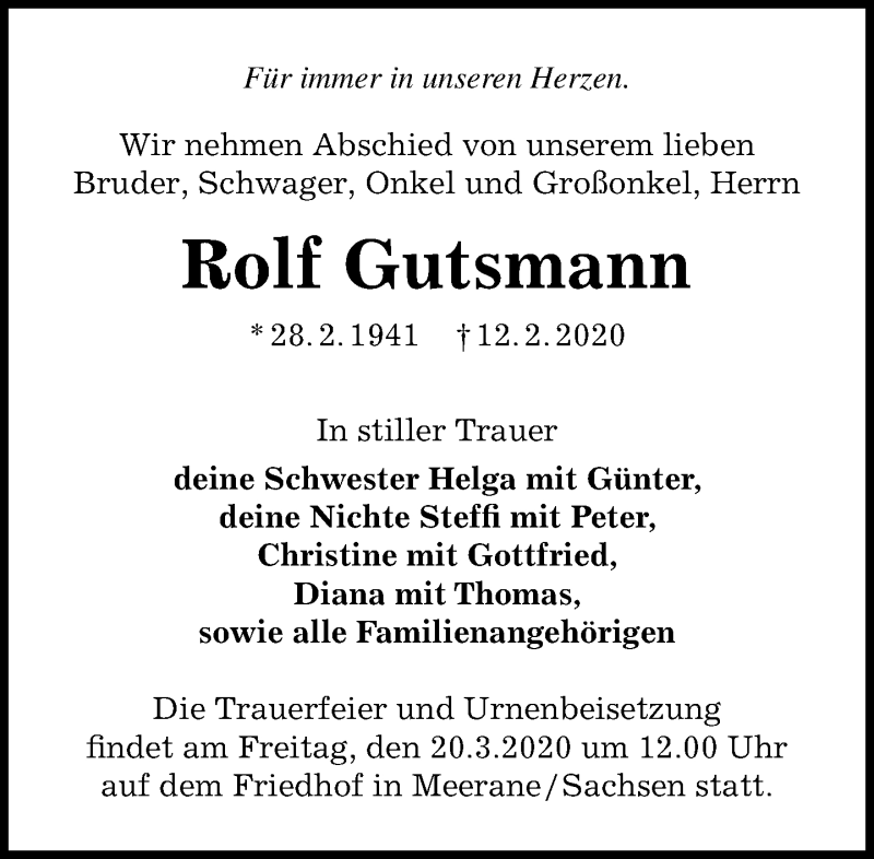 Hier finden Sie alle Traueranzeigen aus der Zeitung, die bisher für Rolf Gutsmann erschienen sind. Weitere Traueranzeigen, die in der Zeitung erscheinen, werden hier ebenfalls aufgelistet