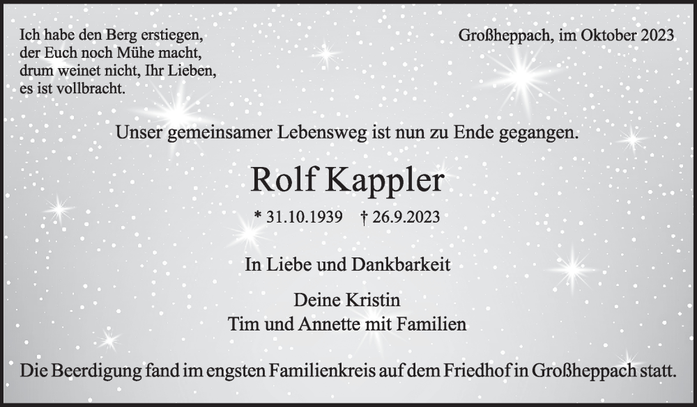 Hier finden Sie alle Traueranzeigen aus der Zeitung, die bisher für Rolf Kappler erschienen sind. Weitere Traueranzeigen, die in der Zeitung erscheinen, werden hier ebenfalls aufgelistet
