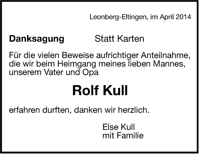 Hier finden Sie alle Traueranzeigen aus der Zeitung, die bisher für Rolf Kull erschienen sind. Weitere Traueranzeigen, die in der Zeitung erscheinen, werden hier ebenfalls aufgelistet