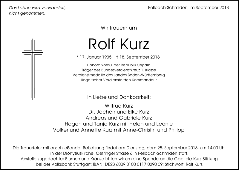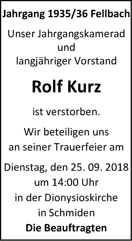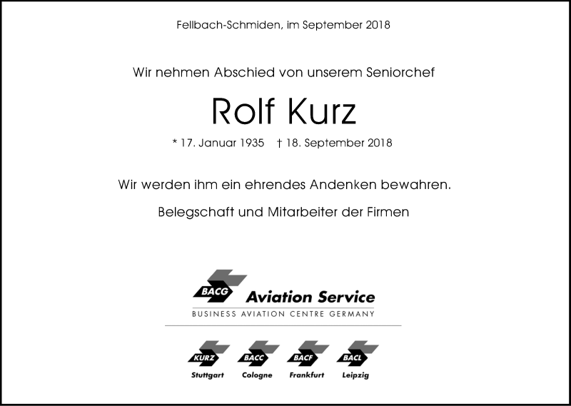 Hier finden Sie alle Traueranzeigen aus der Zeitung, die bisher für Rolf Kurz erschienen sind. Weitere Traueranzeigen, die in der Zeitung erscheinen, werden hier ebenfalls aufgelistet