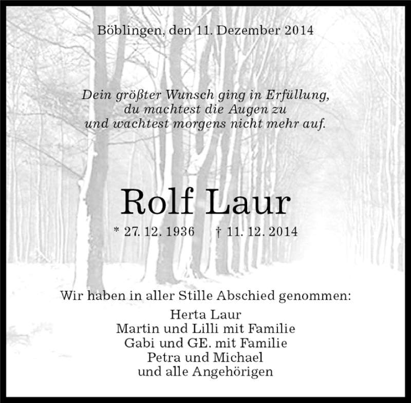 Hier finden Sie alle Traueranzeigen aus der Zeitung, die bisher für Rolf Laur erschienen sind. Weitere Traueranzeigen, die in der Zeitung erscheinen, werden hier ebenfalls aufgelistet